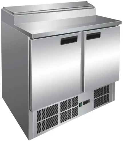 Beskrivelse: Pizzakjølebenk 3 dører 220 cm Pizzakjølebenk: Komplett pizzabenk med 3 dører, kompressor, hevet kjølekrum med glassplate. Kapasitet på ca. 540