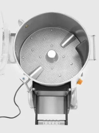Skreller potetene ved hjelp av en slipeskive og slipeputer på innsiden av trommelen.