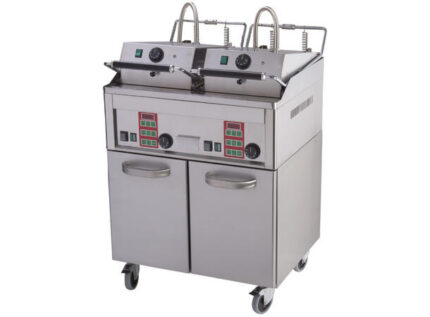 Pressgrill, bordmodell – Rustfritt stål og teflon, 2 stekesoner. FTH-C60-ED+2x KD-30T. Flat stekeflate nede i høyglanspolert rustfritt stål. Overdel med teflonbelegg for enkel rengjøring. Timer-knapper for inntil 6 produkt samtidig. To termostatstyrte stekeflater, hver på 32x48cm. Fettoppsamlingskar i fronten. BxDxH: 66x65x48cm Tilleggsutstyr: